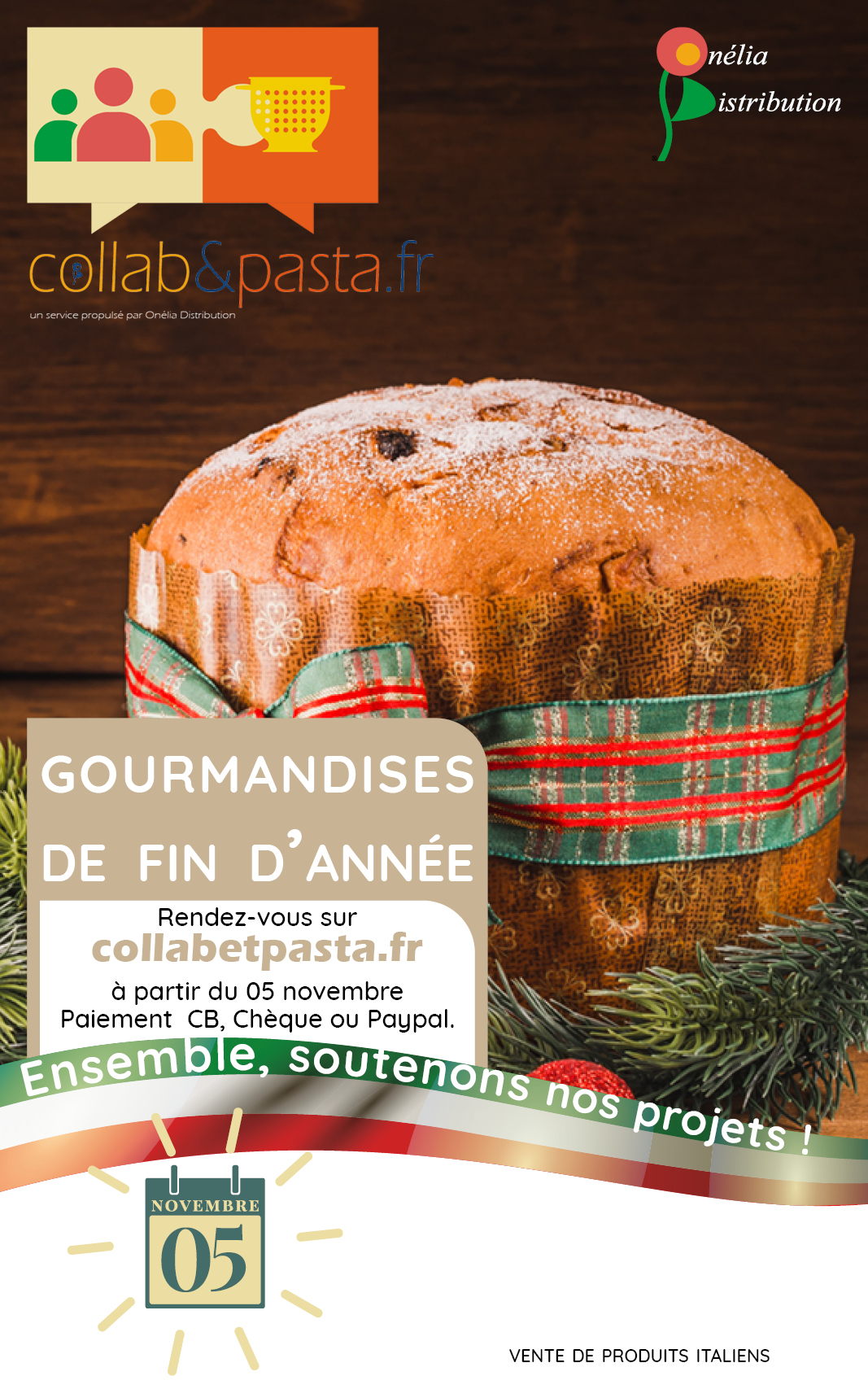 Sélection de produits à déguster, à partager ou à offrir pour des fêtes de fin d‘année gourmandes : panettone, biscuits, torrone, chocolats, pâtes à tartiner, huile d’olive, colis de pâtes...